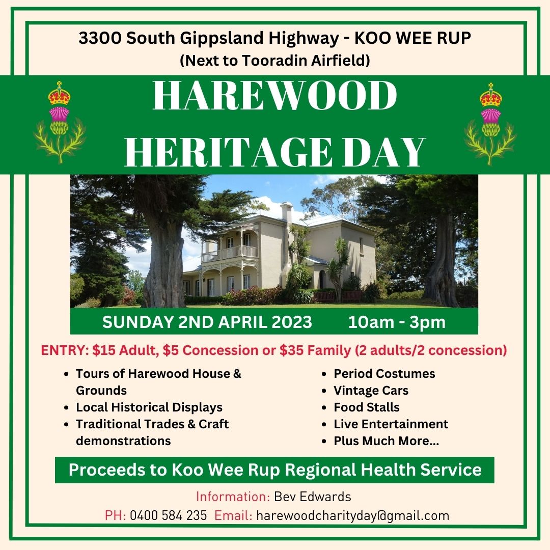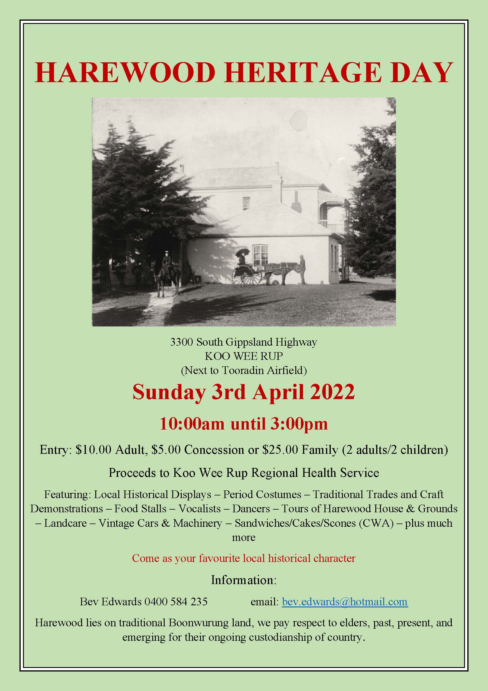 Harewood Heritage Day is back, moving from ‘Scots on the Swamp’ into a broader celebration of Indigenous, post-contact and multicultural heritage. Boonwurung N’Arweet Dr Carolyn Briggs will be Welcoming us to Country in the presence of HM Queen Victoria, HRH Prince Albert and numerous local luminaries of the Victorian era in Victoria. Come as your favourite local historical character or your 2022 self. Proceeds to the Koo Wee Rup Regional Health Service.